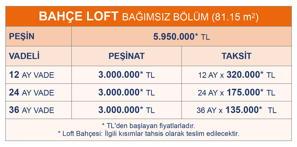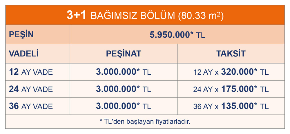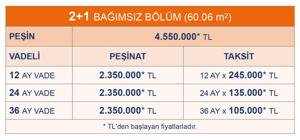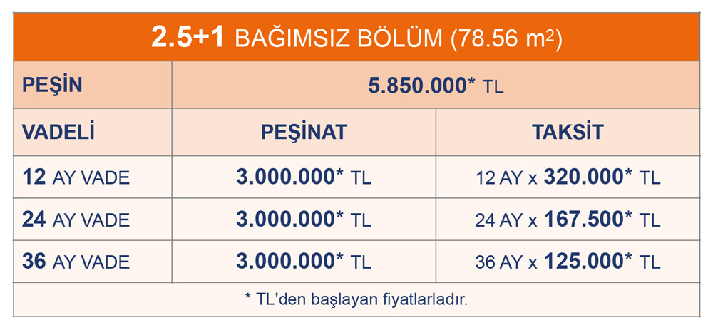 Projeye ilişkin bağımsız bölüm tipleri ve fiyatları sayfanın devamındaki tablolardadır.