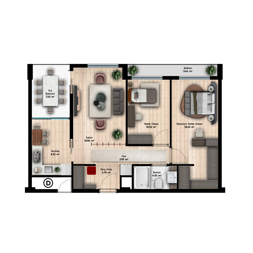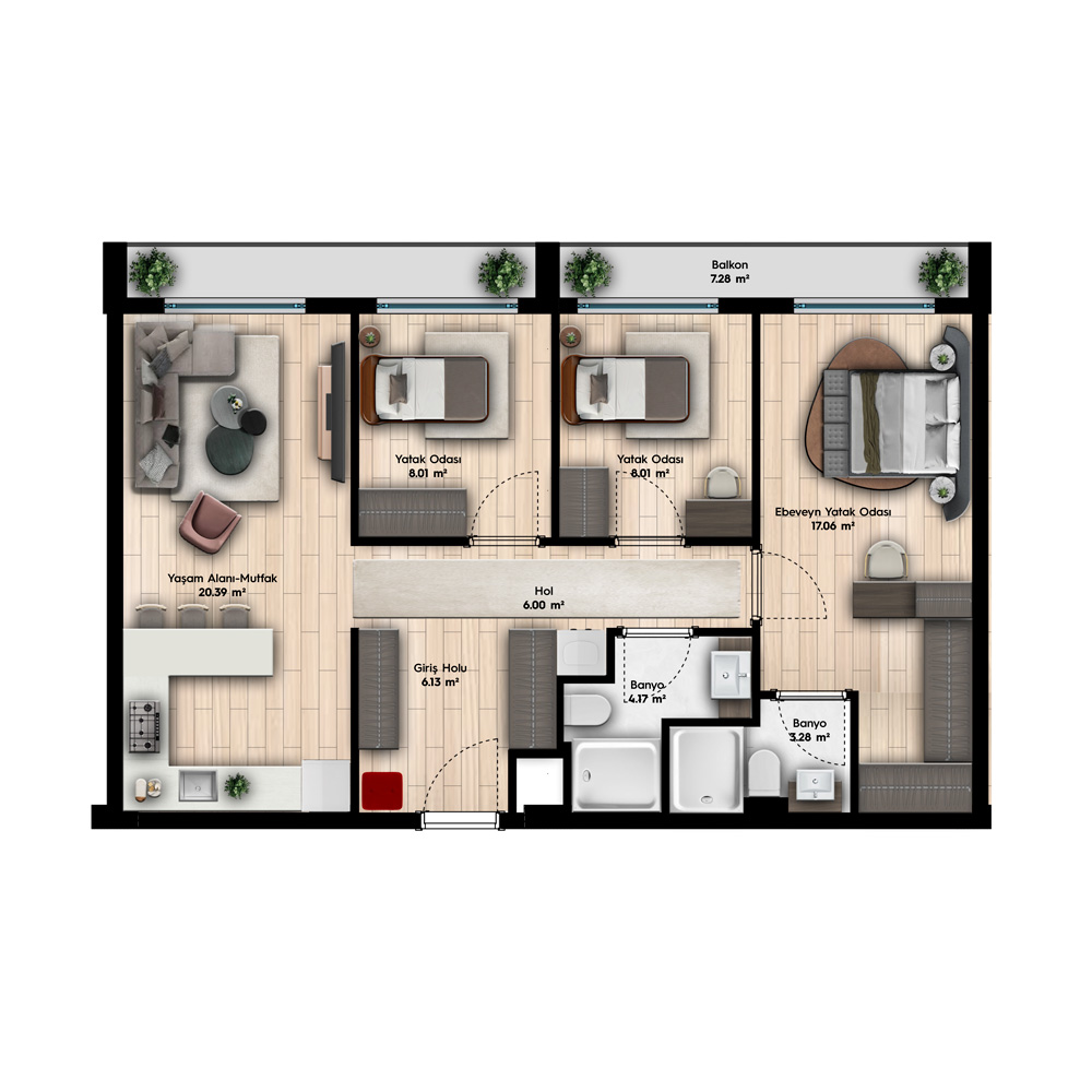3+1 – Bağımsız Bölüm Alanı = 80.33 m2