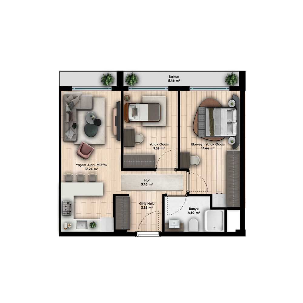 2+1 – Bağımsız Bölüm Alanı = 60.06 m2